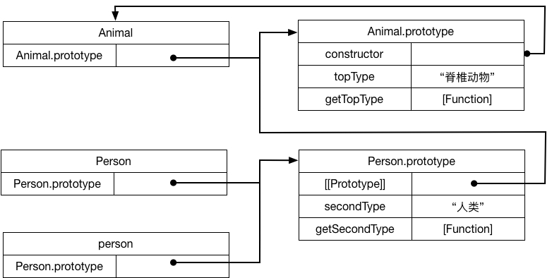 结合前面原型中的讲解,new Animal 产生一个 Animal 实例,该实例对象有一个__proto__指向其构造函数的prototype,将该实例赋值给 Person 的原型,意味着Person的原型 既拥有了 Animal 的所有实例属性或方法,还包含了一个指向 Animal的原型的指针。