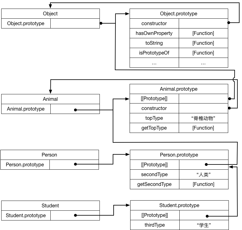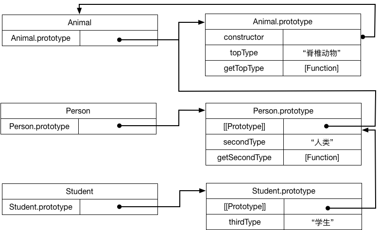 在这里增加了第三个构造函数Student,并且将 Person 实例赋给了 Student.prototype,这样,层级关系将变为 Student 继承了 Person,而 Person 继承了 Animal;Student 拥有 Person 和 Animal 的全部共享属性或方法,Person 拥有 Animal 的全部共享属性或方法